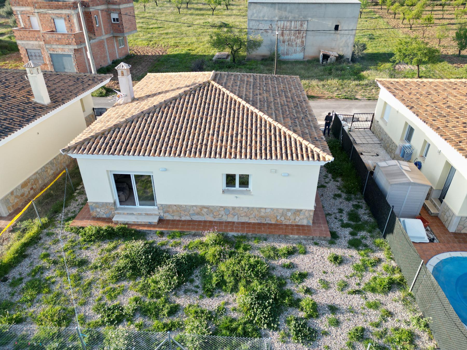 La vivienda tiene 3 dormitorios, 2 cuartos de baño, salón comedor, cocina completamente amueblada con electrodomésticos, lavadero y una parcela de terreno de 270 m2.